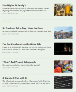 Hi! My name is Matt! I make sure creative projects get done. And I make creative stuff as well. Project Management Game Design Photography Videography Everything Else About Me Check out some of my other creative works! A collection of writings and personal essays pertaining to my travels, both marvelous and mundane. The rule supplement I wrote for D&D 5th Ed. featuring wild magic. Join my newsletter, and keep up to date on all of the happenings and insights from a creative force of defiant optimism.